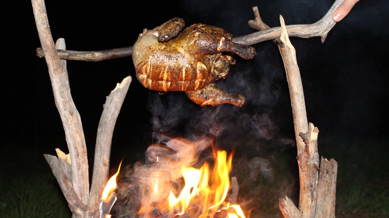 When it comes to cooking over a campfire in the great outdoors, there are so many more options available to you than hot dogs and s'mores. That's not to dismiss the deliciousness of these classic camping culinary staples. But sometimes, an outdoor excursion can call for a little extra effort to be put into that campfire cooking. Luckily, there's nothing stopping you from turning that campfire into a state-of-the-art kitchen appliance — all you need is a will and a way (to keep yourself from abandoning your oven entirely). From fancy cuts of meat to the most humble of vegetables, and all the savory and sweet treats in between, just about anything that can be roasted in the oven can be roasted over a campfire.