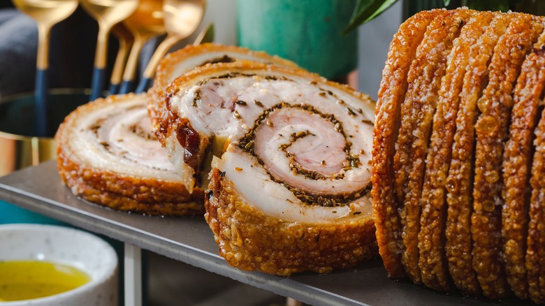 The porchetta is a much-beloved cut of pork, favored for its sublime taste and texture, even with the top culinary celebrities like Anthony Bourdain (who enjoyed a porchetta sandwich here and there). For those who don't know, porchetta is an Italian pork dish featuring a suckling pig, deboned and then rolled into a wheel with herbs and spices. That flavorful wheel is then traditionally roasted over a fire and sliced thin for sandwiches afterward.