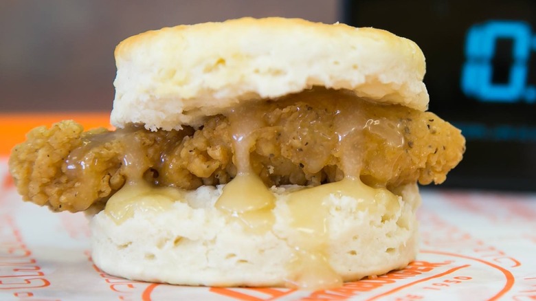 Because of Whataburger's absurd hot sauce boycott, I always have to order the Honey Butter Biscuit and then take it home to season it to my liking. The same goes for all the other breakfast sandwiches, the biscuits and gravy, and the chicken strips with Texas toast. That's all diner food, and what do you do if you walk into a diner with no hot sauce on the table? You turn around and walk right on out of there.