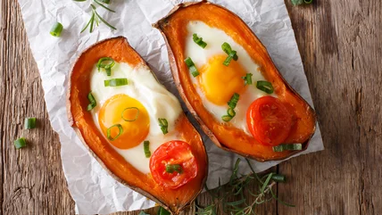 Baking eggs in a halved sweet potato can offer a similar boost, and when topped with salt, pepper, paprika, or your favorite chopped fresh herbs, you're in for a solid meal that will have you leaving the breakfast table feeling like you can take on the day's activities with an extra dose of energetic stamina.