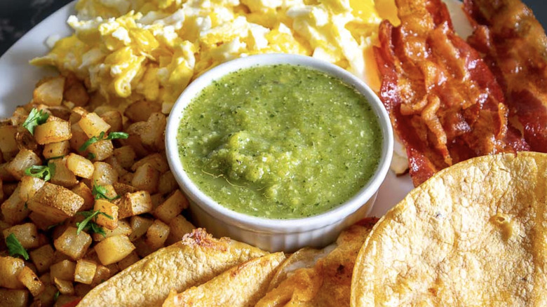 Not to be confused with salsa verde or Texas green salsa, "that green stuff" is much beloved and hotly debated, with devotees claiming both Houston and Austin origins, each with their own theories as to which ingredients are responsible for its creamy texture. Some credit mayo, sour cream, or avocado for its silky smooth mouthfeel. The truth is — there's more than one version of creamy jalapeño Texas green sauce.