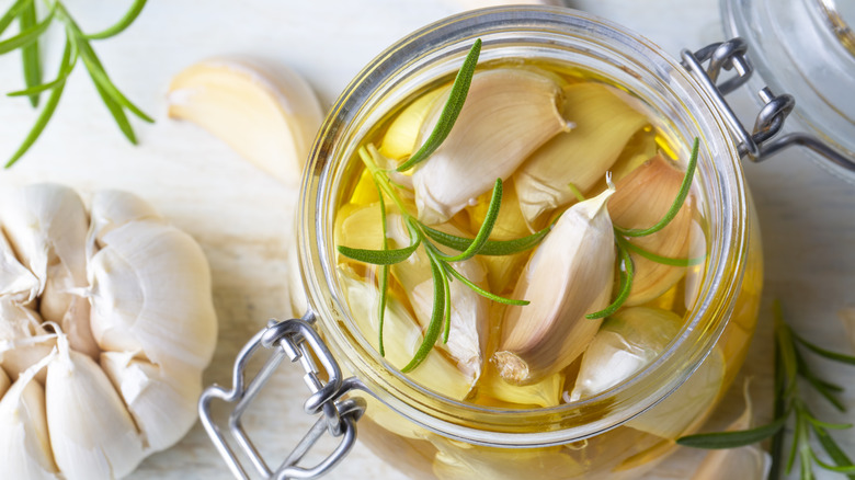 Olive oil is great on its own, but something about adding fresh herbs, spices, and aromatics turns regular EVOO into a centerpiece-worthy creation. But infused olive oil doesn't rely on its good looks to get by. It does some serious culinary heavy lifting as a salad dressing base, a sauce for grilled veggies, or as a soup drizzle. The uses are truly endless, but alas, there's one major downside to infused olive oil — it's liable to make you very sick if you store it in the pantry.