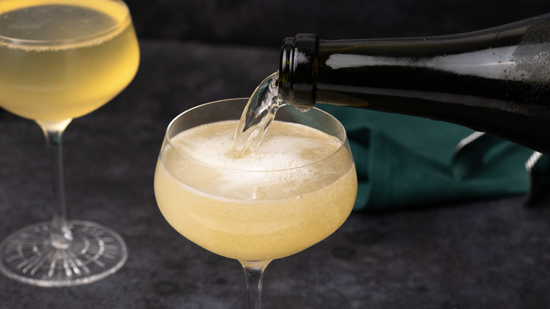 While it may seem an obvious point to make, you will always want to add the fizzy components of a cocktail after it has been shaken, else you'll just end up with a big mess to clean up. To finish off this elegant cocktail, pour the shaker contents into your chosen glass; we recommend either a coupe glass or a champagne flute for this beverage and then top it with the sparkling wine of your choice — chilled, of course.