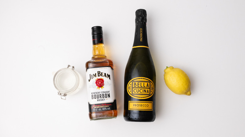 To make this French 95 cocktail, first you will want to gather the ingredients, and the list is a short one: chilled Champagne or prosecco, Bourbon, fresh lemon juice, and simple syrup.