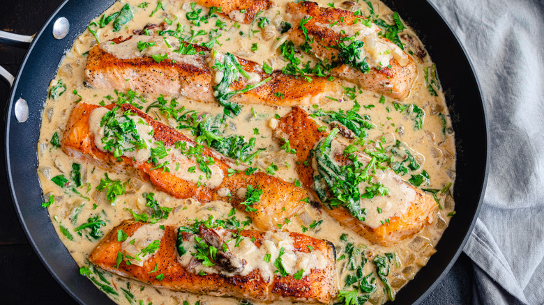 Cookbook author Molly Yeh and her husband love making eggs. In her goat cheese and dill baked egg recipe, Yeh utilizes leftover herbs from her weekly cooking routine, fresh eggs, and savory goat cheese. She adds the ingredients to a "pool" of butter, which she notes helps make a crisp crust on the outside of the eggs (via The Washington Post).