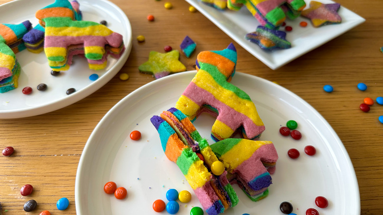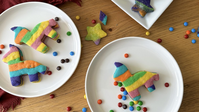 We challenge you to find someone who doesn't like cookies. With a vast array of options from ingredients to textures, as well as shapes and sizes, cookies are the number one versatile treat. We're always ready to bite into a giant chocolate chip cookie, but special occasions call for something novel. Tasting Table recipe developer and pastry chef Katie Rosenhouse brings us these M&M's piñata cookies, and we couldn't be more enthralled. The dazzling cookies are shaped like a piñata and showcase vibrant stripes and multiple layers. Hidden inside is a sweet treat that lives up to this piñata creation.