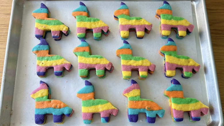 Take the dough cube and cut it into ¼-inch thick slices, for a total of 24 slices. Rosenhouse warns, "Keep the cookies on the thinner side — too thick and your cookie sandwiches will be a mouthful!" Place them on the baking sheets with just a slight space between them. Take your piñata cutter and one by one, cut out 24 piñata shapes from the slices, reserving the dough scraps.