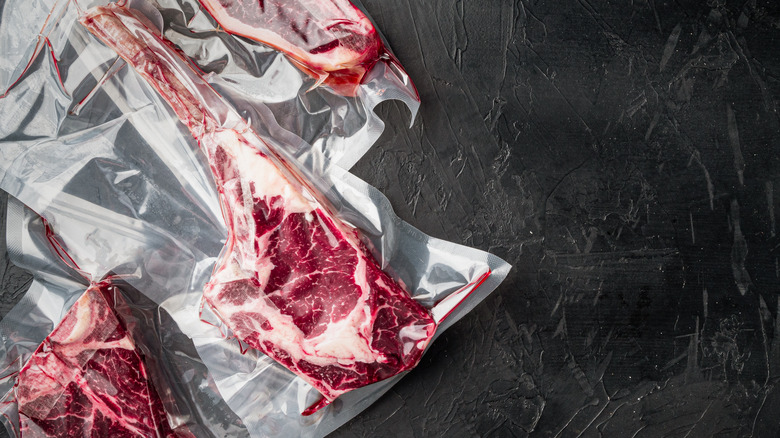 You've found a fantastic recipe and gathered all of the right ingredients. Now it's time to execute the rich bison rib roast you've been dreaming of for days, there's just one problem — that cut of bison that's been on standby in the freezer is an icy block in need of some serious thawing. While you might assume that applying heat would be the foolproof method to defrost things efficiently, this isn't actually the best way to go about thawing. Instead, exercise some patience and take a cooler approach.