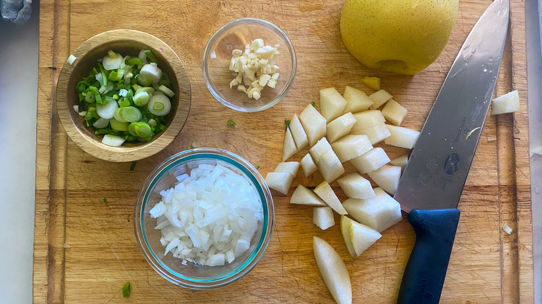 - Chop the onion, garlic, scallions, and the Asian pear (half if the pear is particularly large).
