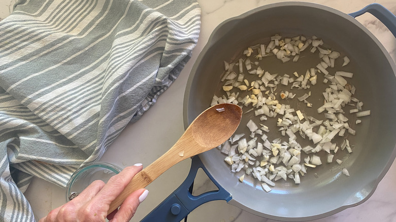 - Add the olive oil to a large frying pan and bring the heat to medium heat. Drop in the onion and garlic and sauté for 3 minutes.