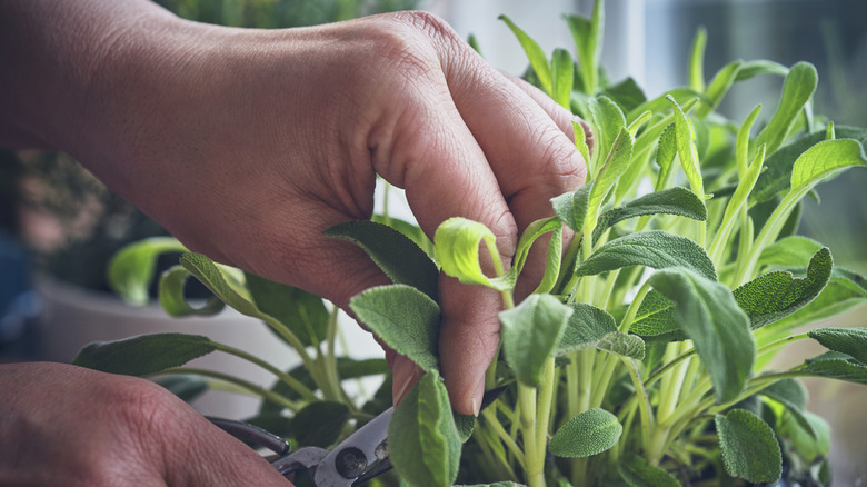 Another method to check sage is by holding it up straight by the stem. No leaves should fall off, and the plant shouldn't slouch or lose its shape. While not always possible, try to avoid buying sage contained in tight plastic packaging. Such conditions will likely lead to moisture buildup, causing wilting to occur quicker. These strategies also apply to storage — so here's what to do with your sage once purchased.