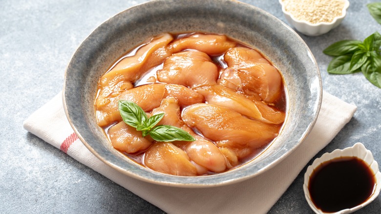 We've all been there — you make a killer marinade for pork chops, chicken thighs, skirt steak, or what have you. You taste it before the meat goes in, and it is vibrant and piquant — just bursting with flavor. So, in goes the meat for an overnight bath. The next day, you take the meat out to cook and look at all that marinade. It seems a shame to let it all go to waste, but can it be used any further now that it has co-mingled with raw meat? The short answer is no, not as it is. But let's go back in time to see how that delicious marinade might be used better.