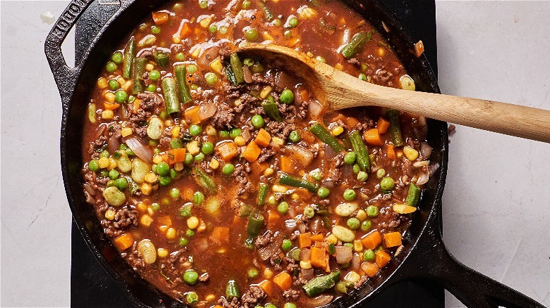 Add the tomato paste to the beef and cook until lightly caramelized, then deglaze the skillet with the red wine. Once the alcohol has burned off and the liquid is nearly evaporated, add the broth, seasonings, herbs, Worcestershire sauce, and vegetables. Simmer the mixture until thick; the liquid won't be completely absorbed, but the filling should be just thick enough to support the tater tots so they don't sink. If some juices remain in the pan, don't worry, as the casserole will continue to thicken in the oven.