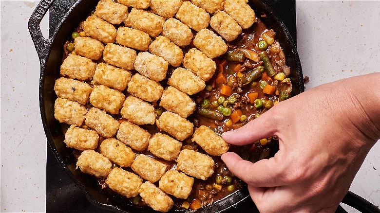 - Once the mixture is thick enough to support the tater tot layer, turn off the heat and add the tots in a straight line across the skillet, working your way down to the other end. With the tater tots covering the casserole in an even layer, place the skillet in the oven and bake until the tots are golden brown and crispy, about 25 minutes.