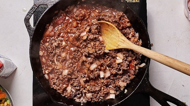 - In a cast-iron or oven-proof skillet, heat the oil over medium heat. Add the beef and cook, using a wooden spoon to crumble up the meat, until browned. Drain the grease.