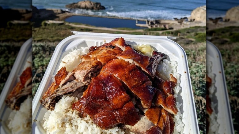 The rice plates are hearty and filling and are served with rice, veggies, and sweet and savory sauces. You can also order a la carte proteins like a whole roasted duck that is entirely deboned. The seasonal garlic greens are a wonderful side that goes well with all of the meats, and the grass jelly dessert drink is the perfect way to end any meal.