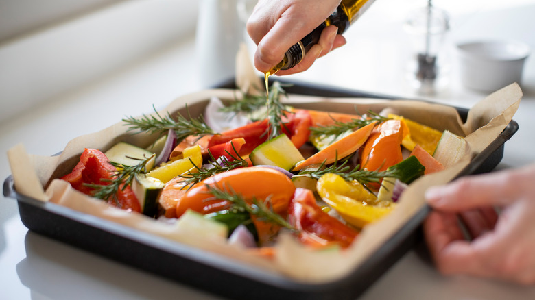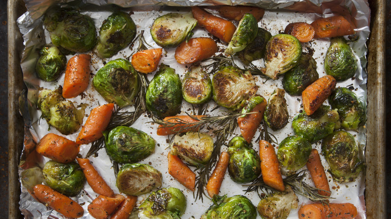 Vegetables certainly aren't one-size-fits-all, but you can find some similar sizes and types that fit together. To ensure an even roast, choose vegetables that match one another in these ways and require similar baking times and temperatures. For example, you can pair the likes of sweet potatoes, regular potatoes, and butternut squash, which all share a starchiness and similar density. Or, you can opt for the stringy pair of green beans and asparagus. You likewise can't go wrong with broccoli with cauliflower, a natural cruciferous combo.
