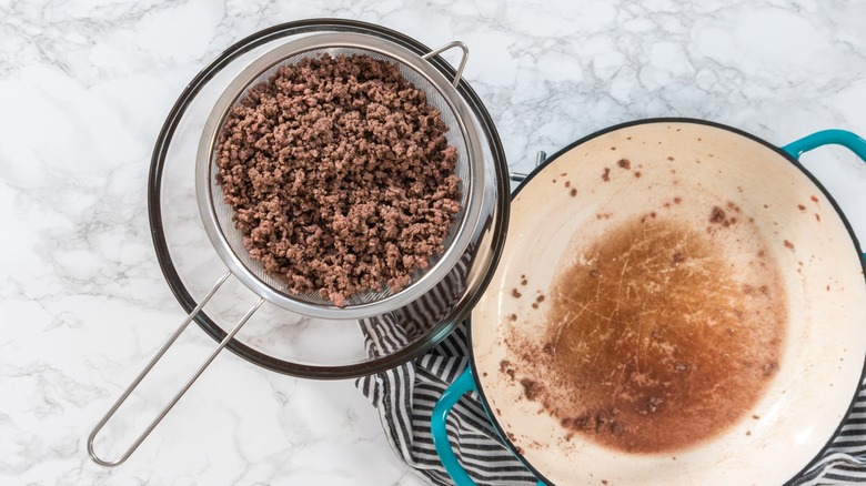 Although it does depend on the kind of meat you're using, generally, you're going to want to drain your meat before you add it to your casserole. If you don't drain your meat, it's not the biggest deal, but you're probably going to end up with a finished product that may be a bit more watery and greasy than you'd really like it to be. And let's be honest: Not everyone wants pools of beef juice floating around their casserole (barf).