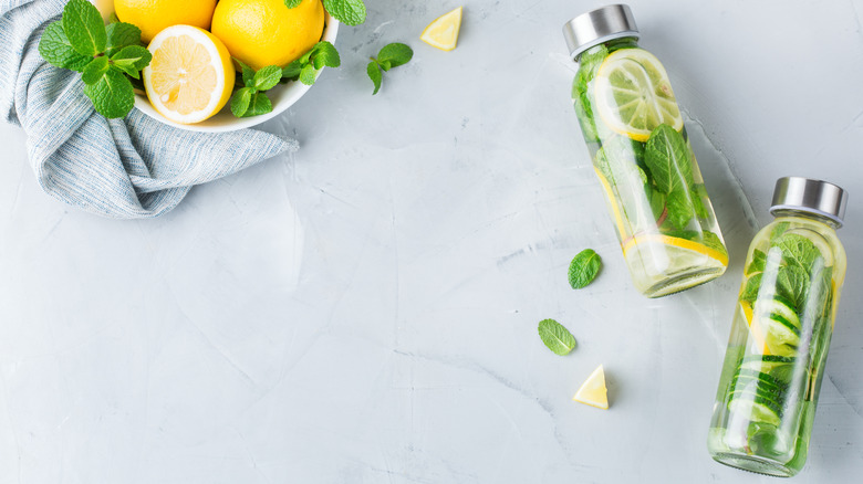 Making a delicious and flavorful pitcher of cucumber water can be as simple as, well, placing sliced cucumbers in water. Yet once you've perfected your cucumber flavor, you may want to incorporate other, complementary ingredients. Think: freshly-cut and crushed ginger or sliced citrus, like lemons, oranges, or limes. If herbs are more your thing, consider adding sprigs of fresh mint or even fresh basil. Herbs clearly complement cucumbers, so you can use whatever you have handy to upgrade your cucumber water from a simple source of hydration to a delicious drink. It's like making a cocktail without the alcohol — and without all the extra effort.