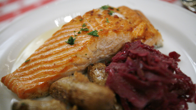 So, though salmon may live in saltwater, that doesn't mean you should assume the meat is already salty and that you shouldn't salt your salmon properly before eating. After all, there's a reason salted salmon is a staple dish across the world — and that reason is because it tastes delicious together. No fuss, no muss, and absolutely no exaggeration; just some tasty, salted salmon.