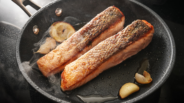 To avoid this mistake, simply apply regular meat measures to your fish, like removing the salmon from the pan before it is entirely done and letting it rest on the side while you prepare the rest of the meal. This ensures the salmon has a chance to rest and finish cooking without overcooking. The end result? A piece of poisson so melt-in-your-mouth tender that you'll second guess any salmon you've cooked before. After all, finding the right internal temperature is critical when it comes to palatable salmon.