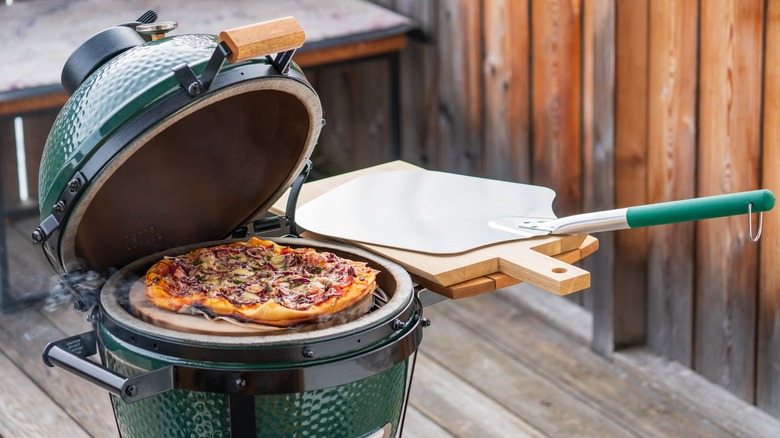Now that you've created a perfect pizza, you need to be prepared to move it from the grill. Trying to take it off with a small spatula or a pair of tongs can lead to the pizza folding in half, ruining all your hard work. A pizza peel is really best because it slides under the entire surface of the cooked pizza, but it is possible to remove the pizza without one. For this, you'll need a combination of tools, starting with a long-handled grill spatula with a wide, nonflexible head. Place this spatula underneath the pizza, reaching all the way to the far end. Then, position a pair of heat-resistant grill tongs to grasp the opposite end of the pizza. Be careful not to squeeze the pizza or exert too much pressure on the crust.