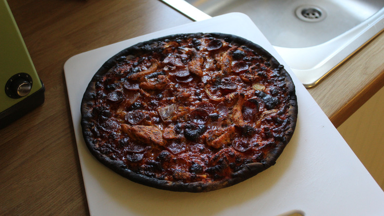 There's a time and place for thin-crust pizza, but the grill is not one of them. The grill's intense heat is more direct than most pizza ovens, so attempting to roll out the dough too thin can lead to problems. Instead of becoming light and crispy, the delicate dough will be more susceptible to charring, imparting a bitter flavor to the pizza. Too-thin crust may also lack the structural integrity to hold the toppings properly. It can become fragile and prone to tearing or falling apart during the grilling process, especially during the stage that requires you to flip the pizza dough over. A slightly thicker crust allows for more even cooking and an easier grilling session.