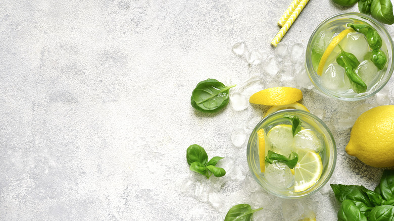 Mint isn't the only herb that has a rightful place with lemonade. Celebrity chef and food television personality Andrew Zimmern's perfect lemonade is made with simple syrup-sweetened lemonade and a judicious handful of basil and mint; it's the perfect accompaniment to his savory ballpark chicken wings. In a video posted to his YouTube channel, Zimmern explains that he makes a frozen version of his favorite drink using an equal amount of basil and mint cut straight from the plant. "The combination of basil and lemon and mint is extraordinary," he claims. He also notes that getting a "completely homogenized" blend of herbs, lemon juice, and syrup is important to prevent people from getting pieces of herbs stuck between their teeth.