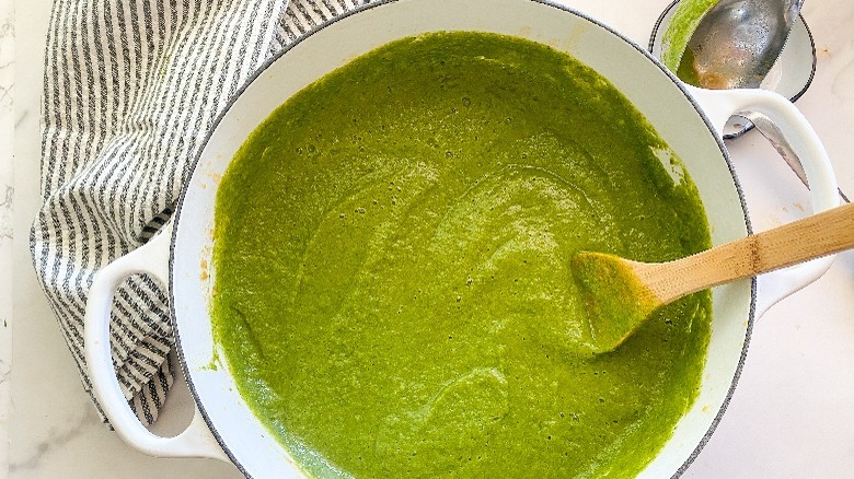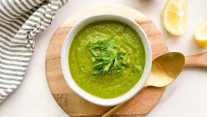 Now we just need to blend the soup into a creamy consistency. Ladle the soup into a blender and add the remaining raw spinach and parsley and blend until smooth. "I prefer to blend this in a full-size blender instead of an immersion blender because I can get it smoother this way. However, you can use an immersion blender, which makes for easier cleanup, but it will take a little longer. Add optional lemon juice, extra chopped parsley and serve. We hope you have a big "to-do" list today — you'll be feeling energized and raring to go!