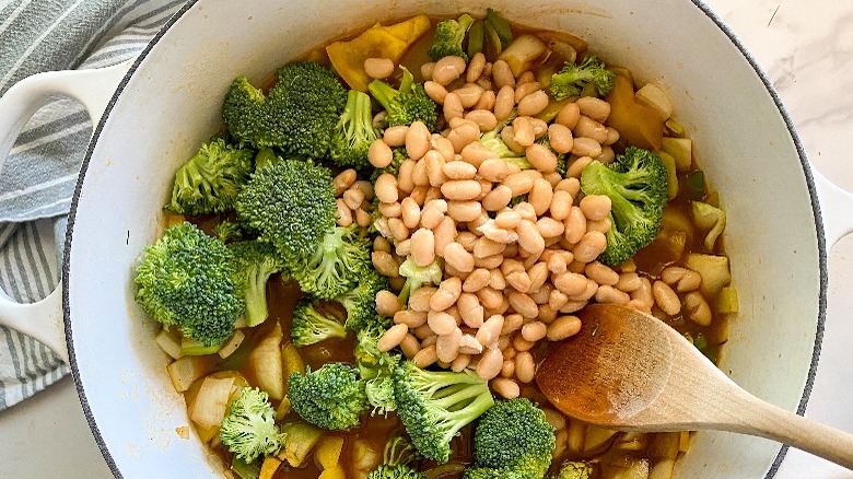 - Add the broccoli, ginger, broth, beans, miso paste, salt, and pepper. Cover and cook on low for 15 minutes. Add half the spinach and parsley and cook on low for 5 more minutes.