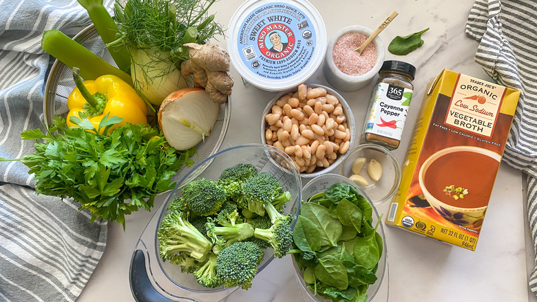 To make this recipe, we'll need quite a few items from the produce department. We'll need an onion, garlic, fennel, celery, yellow pepper, parsley, broccoli, spinach, and ginger. "This combination of vegetables is not only cleansing to the body but a delicious mix of fresh flavors. If you want to add some extra zing, pick up a lemon to squeeze into the soup once it's blended," Hahn shares. Then we'll need some vegetable broth, cannellini beans, miso paste, Himalayan pink salt, and cayenne pepper. "I'm adding the beans here to provide some protein which makes this more filling so it can be eaten as a light meal. They also make the soup extra creamy," Hahn explains.