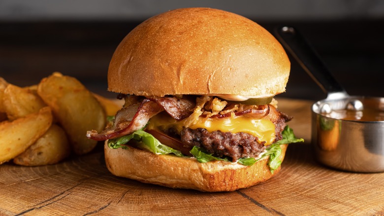 In a YouTube video for Insider Tech, Bourdain lays out his rules for the perfect bun to encapsulate a good burger. The first order of business is that the classic soft and squishy potato bun reigns supreme. Why? Potato buns are mildly sweet, but they do not interfere with the overall taste of the burger or varying ingredients. They have a softness and an absorbency that makes them the perfect candidate for mopping up juices and soaking in excellent flavor, which is all thanks to the heavy starch content from the potatoes.