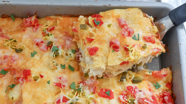 If you're not from Texas, you may not be familiar with King Ranch Chicken — the unofficial "state casserole" of the Lone Star State. But in a state where barbecue and Tex-Mex rule the roost in regard to the most popular cuisines, you'd be hard-pressed to find a Texan who isn't a fan of this layered, tangy, and cheesy casserole dish. "The thing I love about this recipe is that it is kind of like a Tex-Mex lasagna," says recipe developer Jessica Morone. "It has bold flavors, melty cheese, and just enough heat."