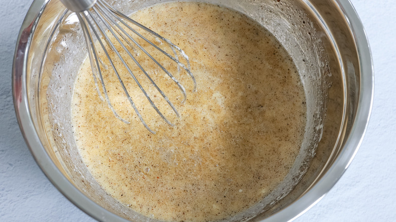 To get started, preheat your oven to 350 F and grease a 9 x 9-inch casserole dish with cooking spray. Then, grab your sour cream, chicken broth, melted butter, garlic powder, chili powder, salt, and pepper, and place them all in a medium-sized bowl. Whisk the ingredients together until they're well combined.