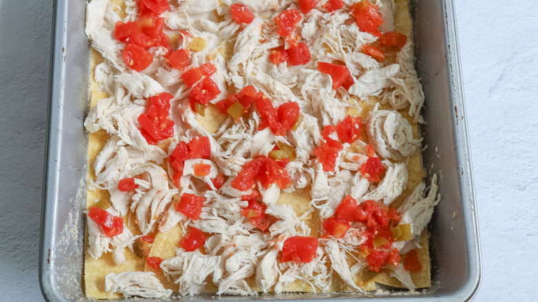 You'll repeat this layering order (sauce, tortillas, chicken, tomatoes, and cheese) a second time, then finish by adding a final layer in a slightly different order — tortillas, sauce, cheese, and tomatoes. You'll finish by sprinkling the diced jalapeños over the top.