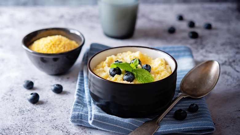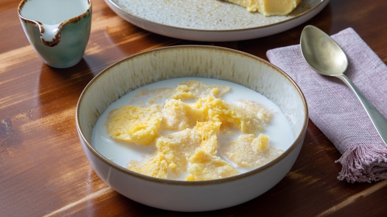 While you could simply boil polenta with milk and sugar like a breakfast porridge, many Italians instead opt to use leftover polenta that's since solidified to craft a cereal-style dish. All you need to do is cut cold polenta into sizable cubes and then add them to a bowl and cover with warmed milk that's been sweetened with sugar. Alternatively, you can even brûlée polenta chunks with sugar and serve with cold milk. The only thing to remember is that if you're using leftover cornmeal, it should be made with either water or milk. Polenta boiled with stock will impart an unpleasantly meaty edge, which is less than ideal.