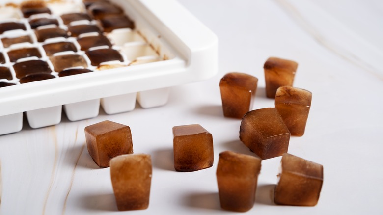 One of the most fun and convenient ways to freeze cold brew is by using an ice cube tray. Ideally, you'll want to use a tray with a lid to maintain freshness — and once icy, you can either leave your cubes in the tray or move them to a plastic bag. The next time you want a cup of joe, you can either stack cubes in a glass with a little water and creamer and wait for them to melt, or use them as ice cubes that won't dilute your cup of iced coffee. It's also important to note that you want to freeze cold brew in its original state. If you mix it with milk, creamer, or a sweetener first, it may not last as long.