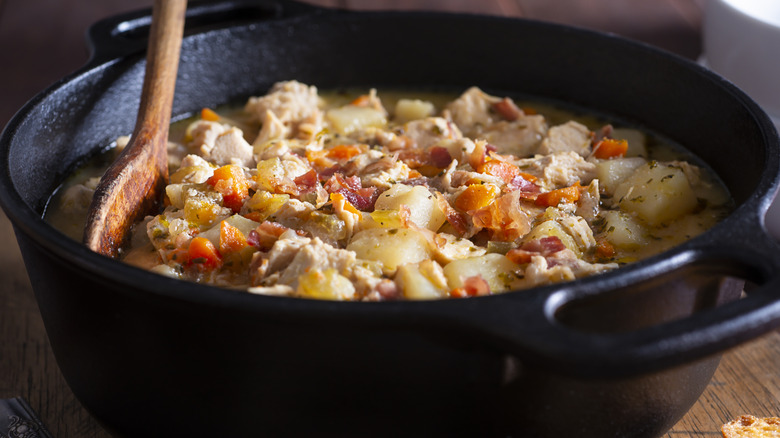 Pillowy soft chunks of potato lend a cozy hominess to many soups, but for all their heartiness, they also bring a tedious amount of peeling and chopping. Enter fingerling potatoes. The uniquely stunted nature of these small taters makes for a perfect soup-making hack. The name fingerling comes from their finger-like shape. Their thin skin, waxy texture, and low starch content make them ideal for chunky soups and stews. Even better, in their skin-on state, fingerlings retain their shape rather than falling apart, ensuring piping-hot, cohesive spuds every time. And because they run so small in size, you'll need only to wash and cut them in half (at most) before popping them in for a nearly effortless soup prep.