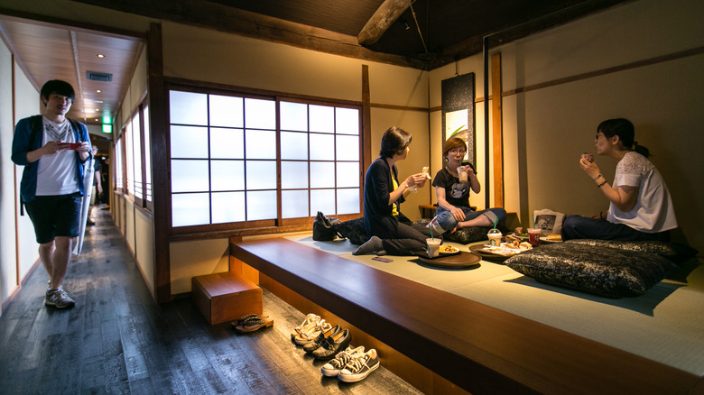 The building in which the store is placed is over a century old, and though the house may have once been used to serve tea, caffeine lovers can now enjoy lattes while sitting next to hand-painted scrolls. This location is the only Starbucks that is marked by a noren curtain, and if discerning visitors aren't careful, the tastefully indicated storefront might be missed. Unlike the well-known green logos that adorn most other stores, this location is marked subtlety, with engravings in the roof's tiles and a hanging wooden sign.