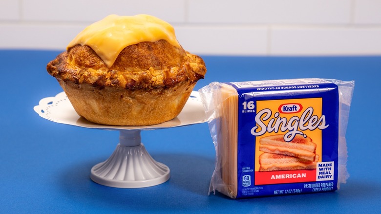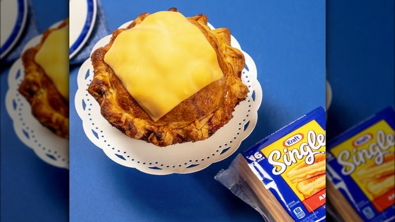 Per a press release, the 5-inch pie is handcrafted and made with golden delicious apples, spices, and gooey Kraft Singles baked into the filling. In classic fashion, this personal pie is also topped with a melted Single. It was created in partnership with a small American business, the NYC-based Little Pie Company, world-famous for its handmade from-scratch pies.
