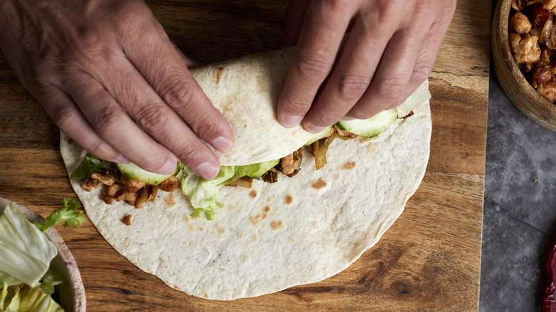 For breakfast, lunch, or dinner, a burrito is always sure to satisfy. And while there's nothing wrong with picking up this convenient classic from your favorite fast food joint, there's something special about making one yourself. Maybe it's that you can put as much filling as you want without having to tell someone across a counter to add more of your preferred protein. Of course, you don't want all of your fillings to fall out of the bottom of your burrito as soon as you take a bite, so if you're going to be wrapping your burrito, you should also know how to seal the ends.