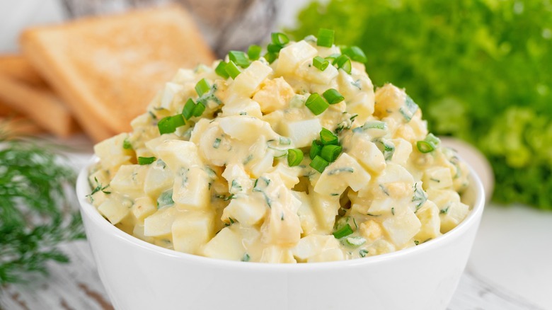 After you've diced your eggs sufficiently, you can add in your standard mayonnaise and salt, or you could elevate it with some flavorful ingredients. There is also the option of smashing your eggs with all of the condiments, herbs, seasonings, and briny vegetables already in the bowl. The best part of using a whisk is that it's a versatile tool: Chop your eggs with it, make aioli, and mix all of your egg salad ingredients afterward. You'll be left with only a whisk and a bowl to clean, with not a bit of yolk residue on your workstation.