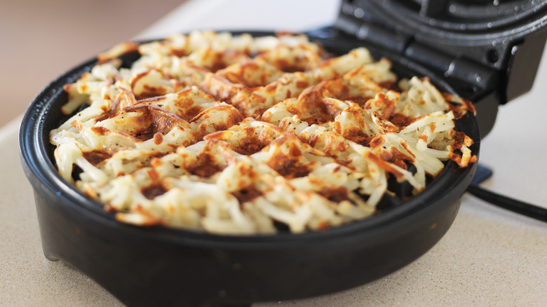 When we think of breakfast in the U.S., we tend to imagine things like pancakes, bagels, eggs, toast, and bacon — while the humble potato often takes a backseat. Gone are the days of soggy home fries, as you can repurpose your trusty waffle iron and transform potatoes into something delightfully crispy and unexpectedly enticing for your morning meal. And it's super simple — microwave whole potatoes, then smush them in your waffle iron to make mouthwatering potato waffles.