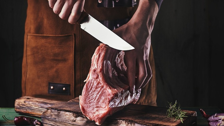 It probably happens by reflex: You're busy chopping your cut of meat using the all-purpose chef's knife, and when you get to the bony part, the most natural thing to do is continue slicing right through. But before you do that, consider the well-being of your blade. Even though chef's knives are sharp and relatively sturdy, they aren't designed to cut hard things like bones — this will damage the cutting edge and blunt the blade faster than you can imagine.