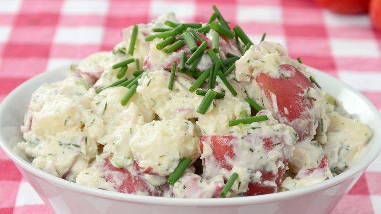 Red bliss potatoes — also known simply as red potatoes — are versatile kitchen ingredients that don't need much embellishment to taste amazing. Use them to make these lemony roasted potatoes, or get the most out of herb season with a flavorful batch of parsley potatoes. But truly, if you have a pound of red potatoes and aren't sure what to do with them, there's one reliable use for these tubers that will knock your dish out of the park every time. Instead of staring at the pile of potatoes in your pantry, make potato salad.