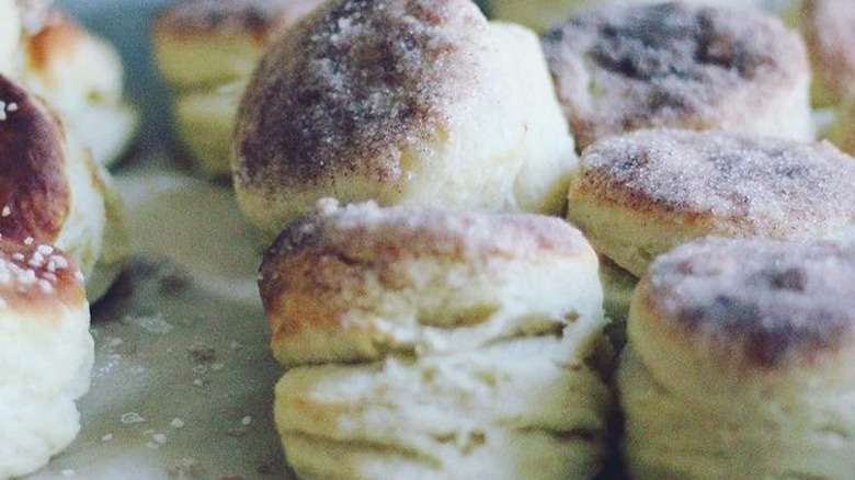 Succeeding at these biscuits is only a little more time-consuming than topping your biscuits with sugar and cinnamon. You'll create the hybrid by topping your prepared biscuit dough with a homemade pretzel wash — a mix of baking soda, egg, and water — instead of buttermilk. After sprinkling the wash with coarse pretzel salt, the biscuits will come out of the oven with a "glossy pretzel sheen" and its top, says Council, will taste "like a salty, tangy biscuit." For an unforgettable sandwich experience, Council suggests serving them fresh with mustard and a griddled sausage — whether spicy or smoked.