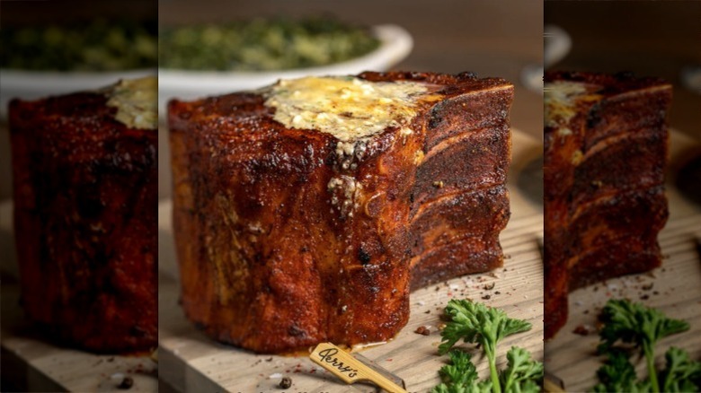 If you're a meat eater, the stack of pork chops served at Perry's Steakhouse and Grille may get your mouth watering. The order you'll get at this chain steakhouse, with locations spread across 8 states, isn't a typical presentation of pork chops. When brought to tables, the stack of meat measures seven fingers high, just like butchers used to measure the size of their cuts many years ago. Standing tall at nearly 6 inches, at least two diners will need to get ready to dig into this beast — and it isn't just the size of the meat that is worth a mention. It takes several days to get these pork chops ready, and the smoking process can last the better part of a day before the hunk is ready to be roasted. Whether it is the special seasoning used to flavor the pork chops or the rotisserie of pecan wood, these chops have rightfully earned a serious reputation.