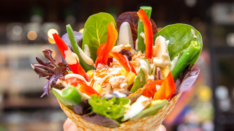 And just like their French counterparts, Japanese crepes offer various fillings. Lin explained that "Japanese crepes can be sweet or savory" and that one of the T-Swirl Crepe fan favorites is the "Strawberry Bananacrepe which features fresh slices of strawberry and banana, luscious custard cream, tangy-sweet whipped yogurt, petite chocolate pearls, and crunchy crushed pistachio." For savory Japanese crepe ingredients, possibilities include "smokey bacon, crisp iceberg lettuce, hard-boiled egg, sweet grape tomatoes, creamy avocado, and crunchy shallots all smothered in chipotle aioli and sesame dressing."