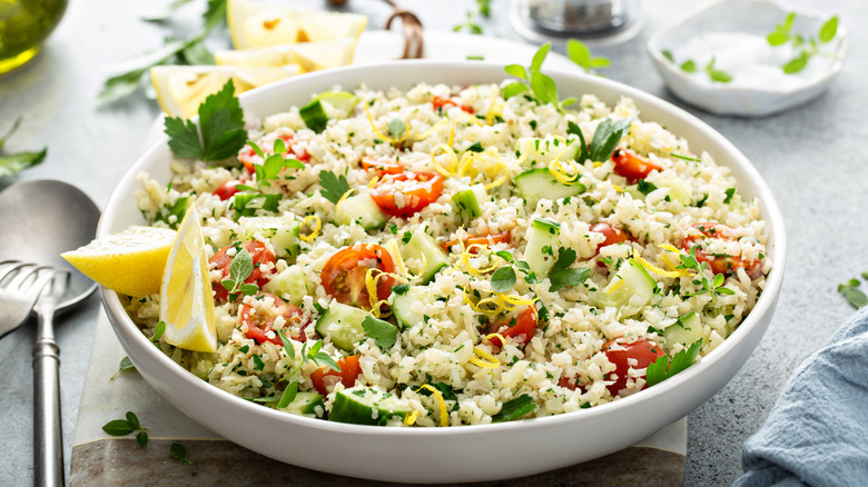 Frozen cauliflower rice should also be your first choice as it boasts the same great taste as fresh rice. Evidently, it can be used in power bowls, stir-fry recipes, and everything in between. The one thing to keep in mind is that frozen cauliflower rice is prone to becoming mushy when cooked incorrectly. That said, while many swear by slightly thawing the pieces and wringing them out prior to cooking, this actually isn't ideal. Rather, it's best to use the rice from frozen, cooking over high heat for a matter of minutes — simmering will only lead to increased sogginess.