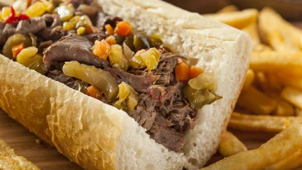 There is a particular way in which the chuck roast for an Italian beef sandwich is cooked that makes it extra flavorful. Chuck is a particularly tough cut from the neck and shoulder of the cow and therefore requires low and slow cooking in beef broth to make it tender enough for sandwiches. Once the beef is finished cooking, it is shredded together with some pepperoncini peppers and their brine, which provide a mild, salty heat. After slicing, the meat is put back in the au jus to soak up as much juicy flavor as possible. The sandwich is assembled by spreading the tender beef on a hoagie roll, adding the toppings, and then dipping the sandwich end in the broth, like a French dip. Hoagie rolls are best for this sandwich because they are able to absorb the juices without falling to pieces.
